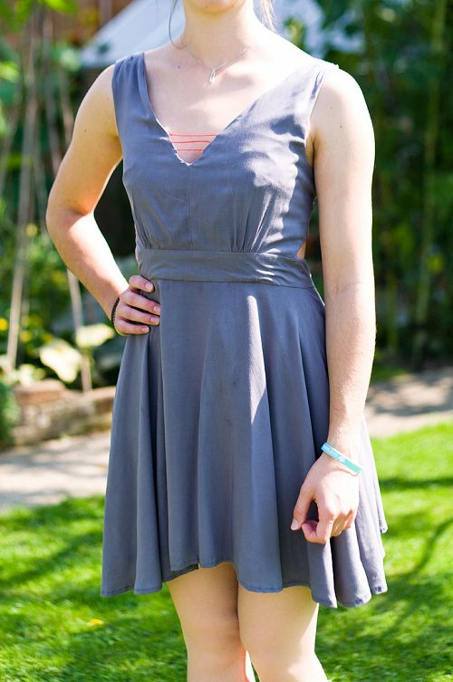 Soft draping viscose fashioned into a comfortable but party ready dress. Red detailing and small pleats accent certain parts to add interest and an a-line skirt beautifully demonstrates how the fabric falls.
