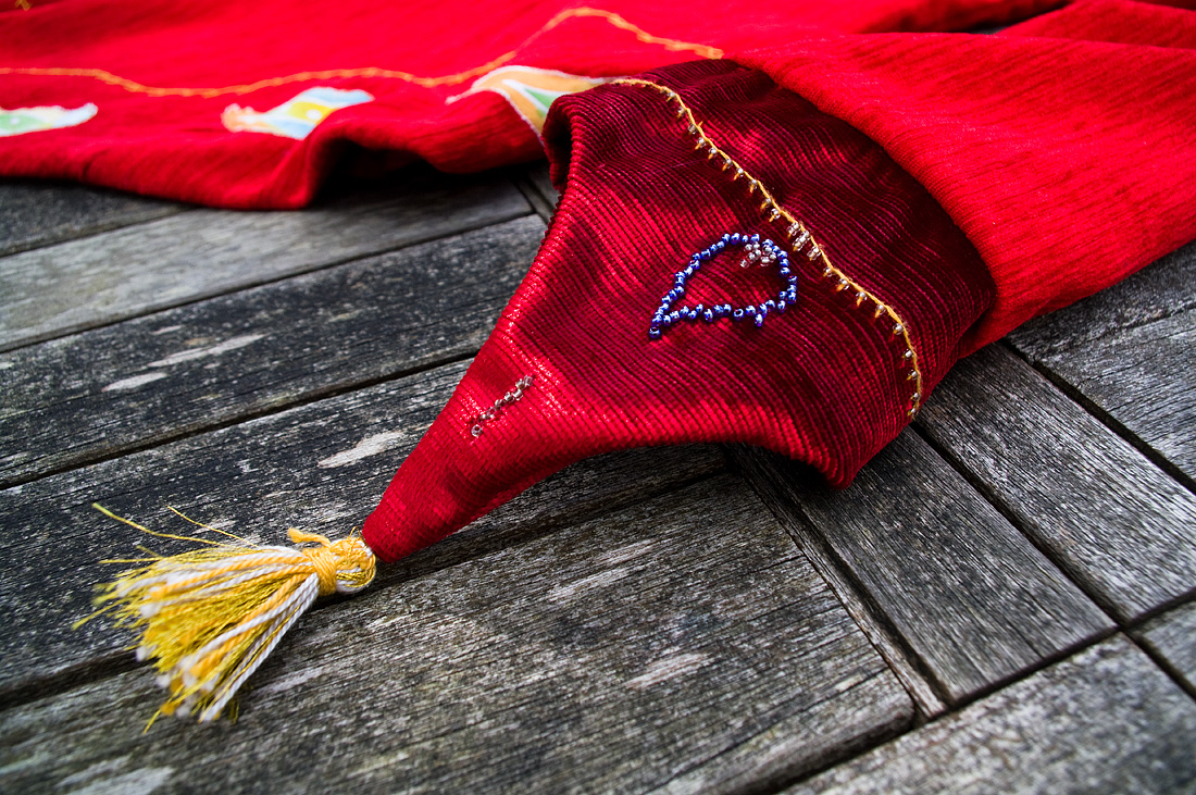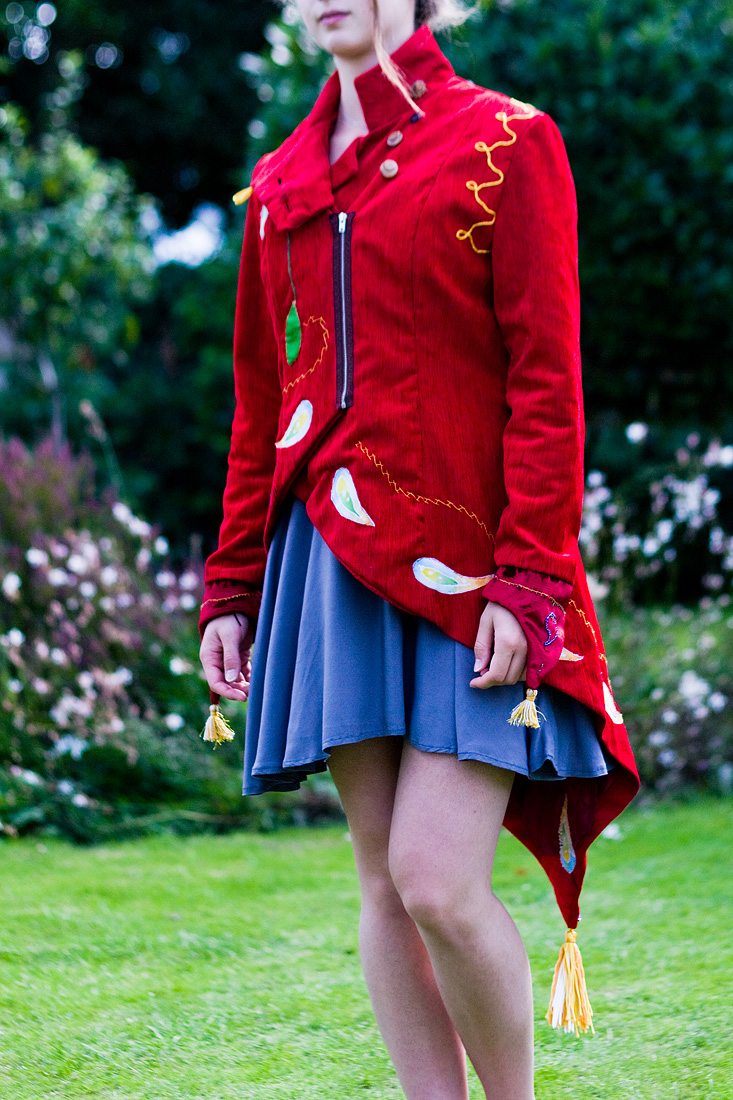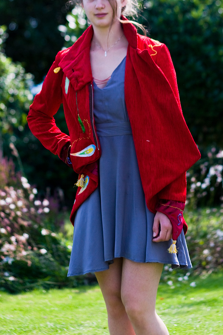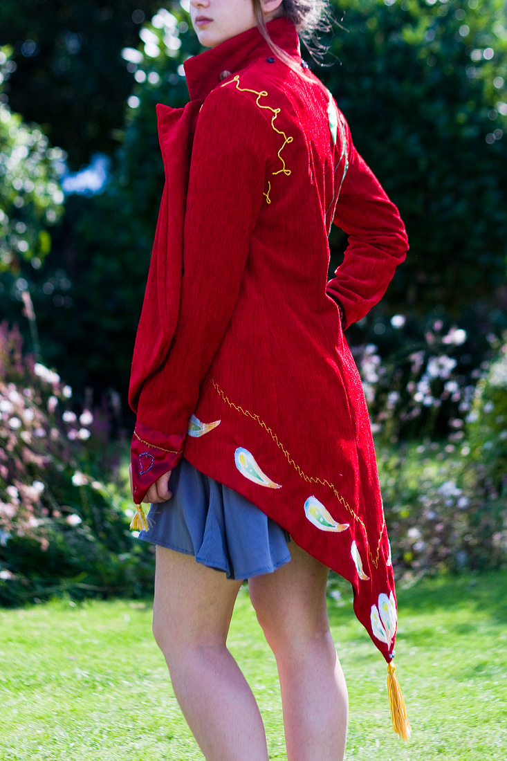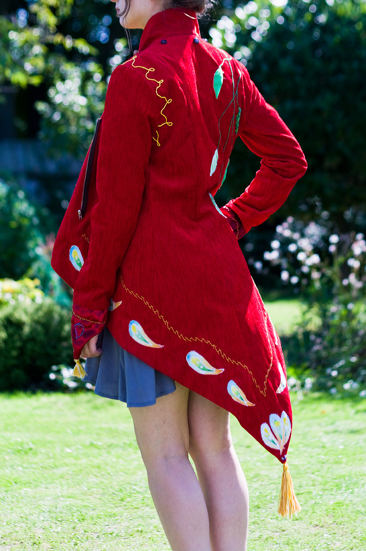 Designing and making a garment for a special occasion this red coat was produced for Christmas, inspired by a variety of asymmetrical shapes and patterns. It features several different textured fabrics and has a nice weight due to the thick (actually upholstery) materials used.